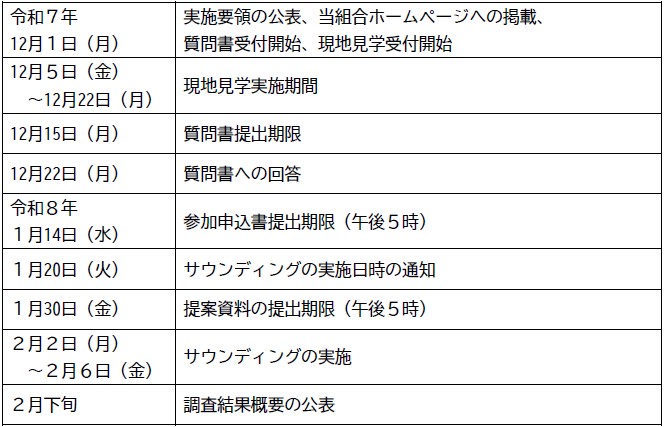※ 上記「実施スケジュール」中の現地見学実施期間中に、施設の現地見学を個別に受け付けます(参加任意)。現地見学を希望する場合は、上記担当部署に電話または電子メールにて連絡のうえ、下記「実施要領・様式等」中の現地見学申込書(様式2)を、電子メールにより同担当部署に提出してください。